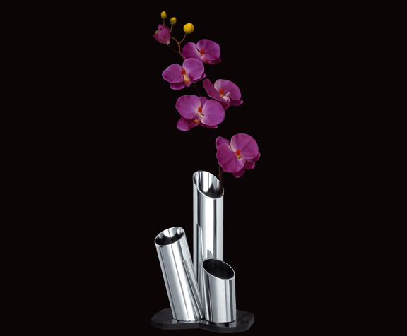 Objects for a highly advanced modern table design made from bent, curved and laser-cut stainless steel sheet.